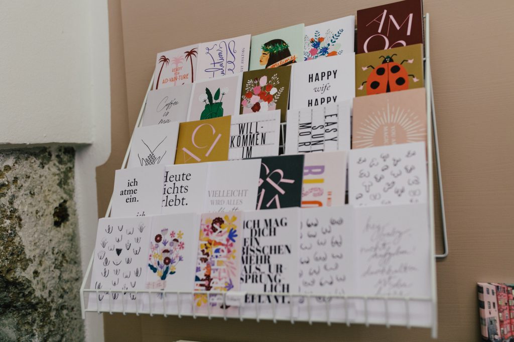 Ganz besonders verliebt habe ich mich in die Designs der Innsbrucker Künstlerin Vanessa Sonnewend. Sie zeichnet unter ihrem Label Miao herzallerliebste Karten mit tollen Sprüchen und wahren Weisheiten. Wer es lieber etwas minimalistischer mag, wird bei den Designs von Studio Typealive fündig. Postkarten mit coolen Sprüchen und in dezenten Farben. Zum Verschenken oder auch zum Aufhängen für zu Hause.